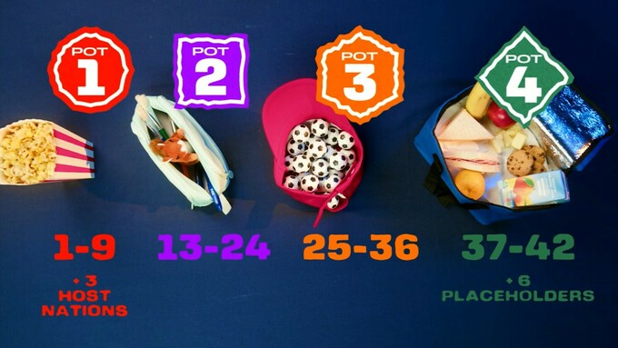 Господарі турніру Мексика, Канада та США автоматично отримають позиції A1, B1 та D1 відповідно. В одній групі не може бути двох команд із однієї конфедерації (крім УЄФА). Кожна група має містити щонайменше одну, але не більше двох європейських команд.