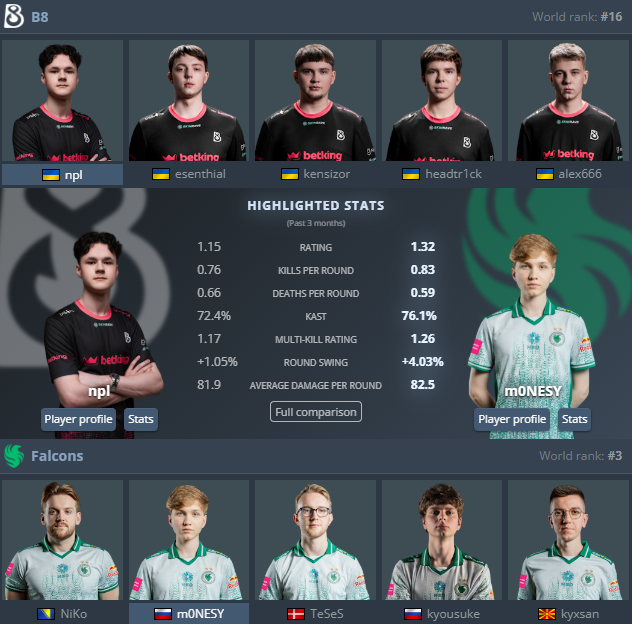 B8 Esports наразі посідають 16-шу позицію у світовому рейтингу HLTV, тоді як Falcons розташовані значно вище та входять до топ 3 команд світу.