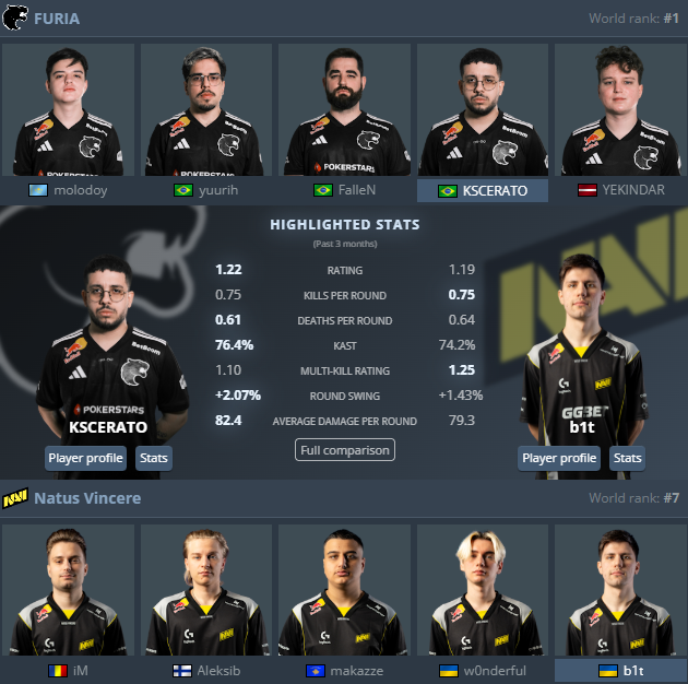 NAVI наразі посідають 7-му позицію у світовому рейтингу HLTV, тоді як FURIA розташовані значно вище та знаходяться на першій сходинці рейтингу.