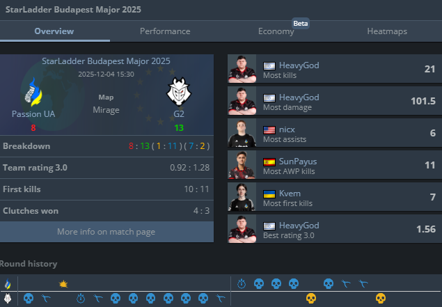 Проте 11 програних раундів у першій половині зіграли з Passion UA злий жарт. Попри блискучу другу частину матчу, G2 Esports все ж закрили гру з рахунком 8:13, не дозволивши оформити історичний камбек.