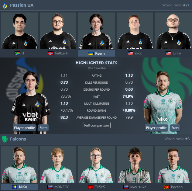 Passion UA наразі посідають 21-шу позицію у світовому рейтингу HLTV, тоді як Falcons розташовані значно вище та входять до топ 3 команд світу.