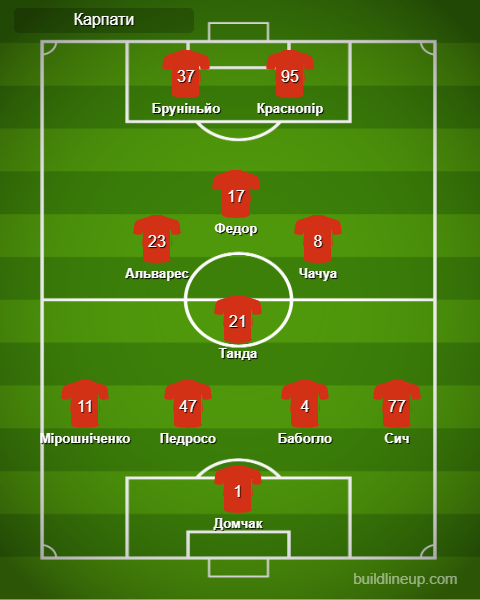 «Карпати»: Домчак – Мірошніченко, Педросо, Бабогло, Сич – Альварес (Пауло Вітор, 63), Танда, Федор (Карабін, 63), Чачуа – Бруніньйо, Краснопір (Костенко, 90+2).