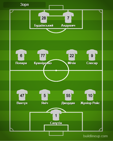 «Зоря»: Сапутін – Вантух (Малиш, 69), Яніч, Джордан, Жуніор Рейс – Попара, Кушніренко, Мічін (Башич, 76), Слесар (Дришлюк, 90+3) – Будківський, Андушич.