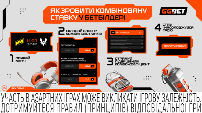 На сайті та в додатках GGBET гравці можуть зробити комбіновану ставку на матч, обираючи різні варіанти розвитку подій всередині нього. Наприклад, у футболі – крім популярних ставок на перемогу і тотал голів – хто з команд буде перемагати в першій чи другій половині матчу, яку кількість голів заб’є конкретний гравець і багато іншого. В CS2 – яка з команд переможе на конкретній мапі, яку кількість кілів зробить конкретний гравець, скільки раундів в межах мапи буде зіграно і т.д. Серед українських букмекерів бетбілдер на кіберспортивні матчі доступний лише на GGBET.