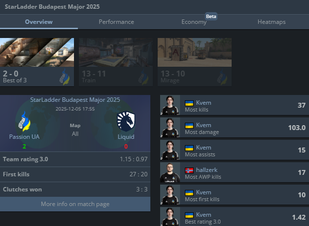 Першою мапою став Train, де Liquid впевнено стартували та повели 9:3, однак після зміни сторін усе змінилося. Їхній напад повністю зламався, і Passion UA збудували надзвичайно мобільний захист.