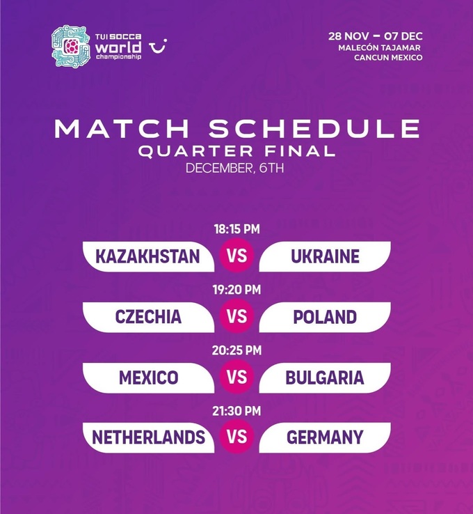 Матч 1/4 фіналу між Україною та Казахстаном відбудеться у ніч на 7 грудня о 01:15 за київським часом (6 грудня о 18:15 за місцевим). Переможець вийде до півфіналу на найкращого в парі Мексика – Болгарія. В інших чвертьфіналах зіграють: Чехія – Польща, Нідерланди – Німеччина.