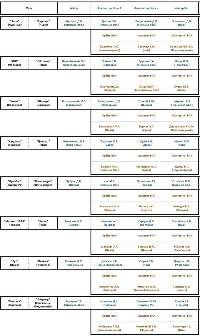 Визначено суддівських бригад на матчі Української Прем'єр-ліги 2025/26.