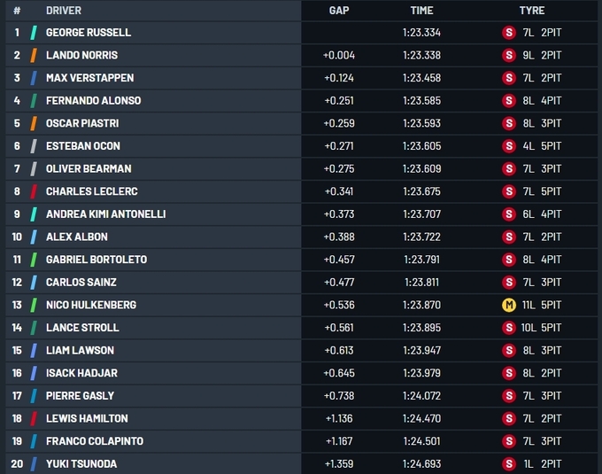 Расселл лише на 0,004 секунди випередив Ландо Норріса. Головний претендент на титул поки що швидший за своїх конкурентів Оскара Піастрі і Макса Ферстаппена.