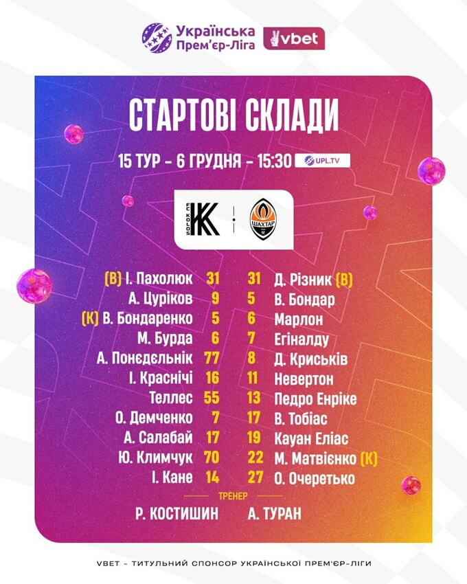Наставники команд – Руслан Костишин та Арда Туран – визначилися зі стартовими складами на цей поєдинок. Зустріч розпочнеться о 15:30 за київським часом.