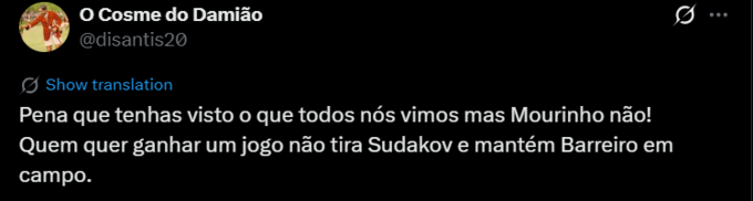 O Cosme do Damião: Шкода, що ви бачили те, що бачили ми всі, але не Моуріньо! Той, хто хоче виграти гру, не знімає Судакова з поля і залишає Баррейро.
