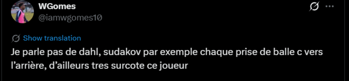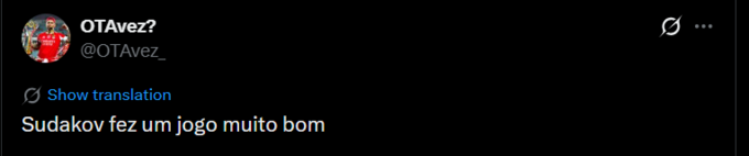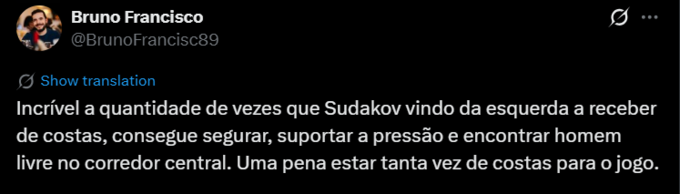 Bruno Francisco: Неймовірно, скільки разів Судаков, проходячи зліва та приймаючи м'яч спиною до воріт, встигає втриматися, витримати тиск і знайти вільного гравця в центральному коридорі. Шкода, що він так часто стоїть спиною до гри.