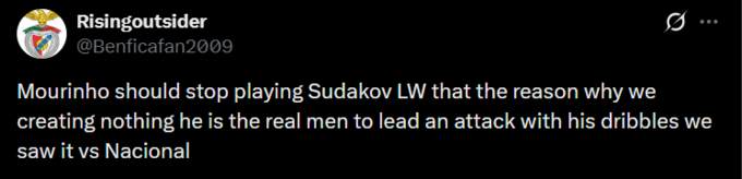 Risingoutsider: Моуріньо має перестати ставити Судакова лівим вінгером, але причина, чому ми нічого не створюємо, полягає в тому, що він справжній гравець, який може вести атаку своїми дриблінгами, ми бачили це проти «Насьоналя».