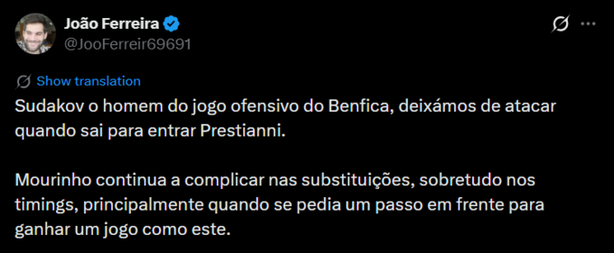 João Ferreira: Судаков, головний атакуючий захисник "Бенфіки", перестав атакувати, коли Престіанні вийшов на поле. Моуріньо продовжує ускладнювати ситуацію замінами, особливо їх своєчасністю, особливо коли для перемоги у такому матчі був потрібен крок уперед.