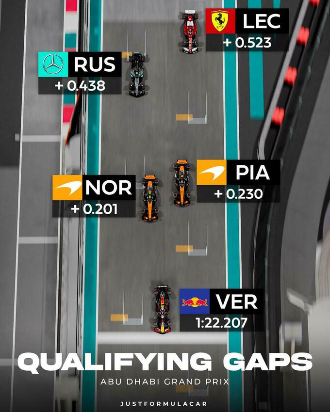 До цієї події JUST FORMULACAR підготували візуалізацію відривів у кваліфікації Гран-прі Абу-Дабі, яка показує розриви між пілотами Макларен, Мерседес, Феррарі і Ред Булл.