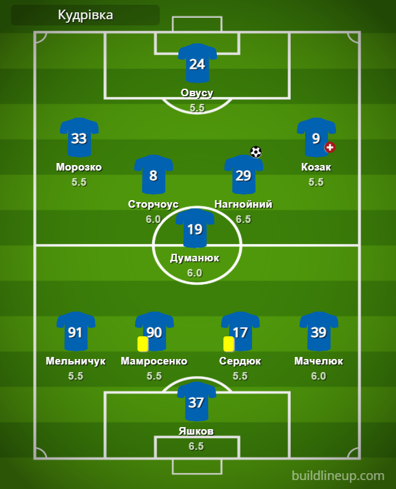 «Кудрівка» (заміни): Рогозинський – 6,0, Матвєєв – 5,5, Коркішко – 5,5, Світюха – 5,5, Демченко – б/о.