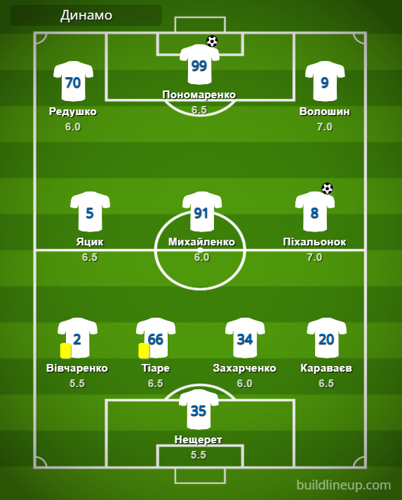«Динамо»: Нещерет – Вівчаренко, Тіаре, Захарченко (Михавко, 88), Караваєв – Яцик, Михайленко, Піхальонок (Шапаренко, 77) – Редушко (Кабаєв, 62), Пономаренко (Герреро, 62), Волошин.