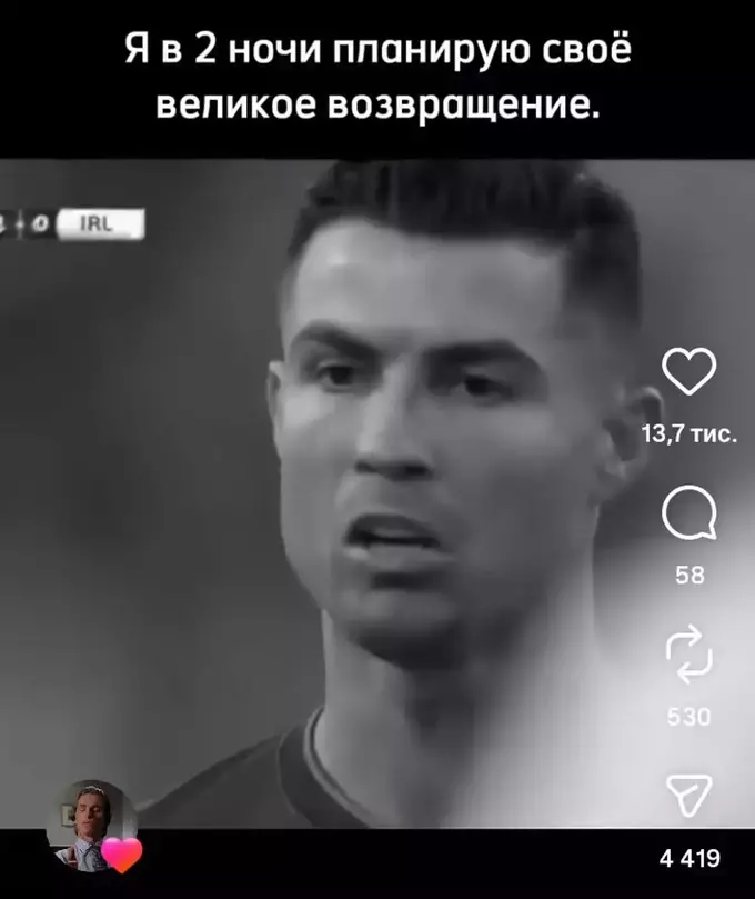 Футболіст лайкнув пост в Instagram, де на відео з Кріштіану Роналду звучить фраза: «Інші будують плани на майбутнє з партнером опівночі. Я в 2 ночі планую своє велике повернення».