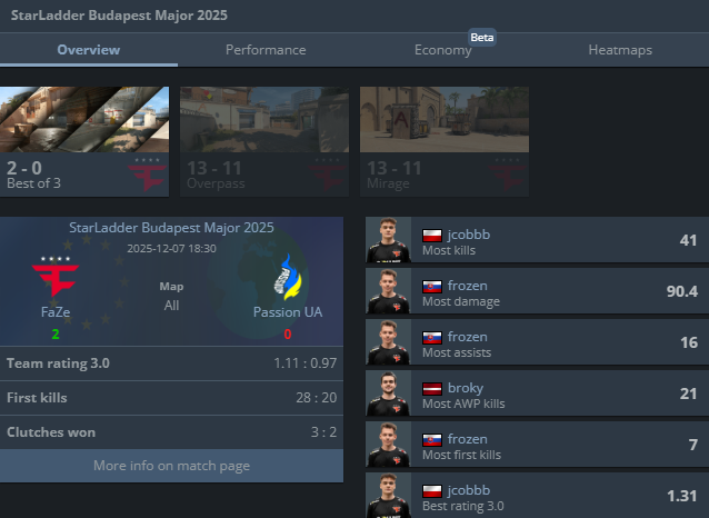 FaZe потрапили у ще складніше становище, коли помилка broky дозволила Passion UA виграти другий 3v5 у половині. Але команда стабілізувалася завдяки черговому вирішальному моменту від jcobbb, після чого оформила перемогу 2:0.