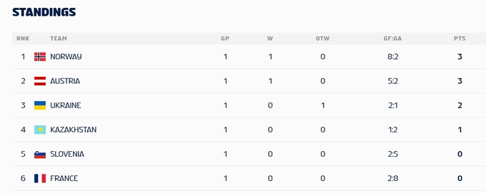 Українці у першому турі обіграли Казахстан з рахунком 2:1 в овертаймі. З двома очками українські хокеїсти йдуть на третьому місці, поступаючись Норвегії та Австрії.