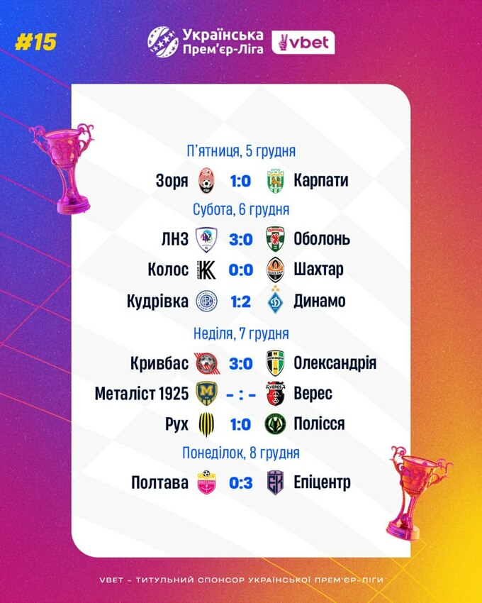 З 5 до 8 грудня відбувся 15-й тур Української Прем’єр-ліги 2025/26, це був останній вік-енд першого кола.