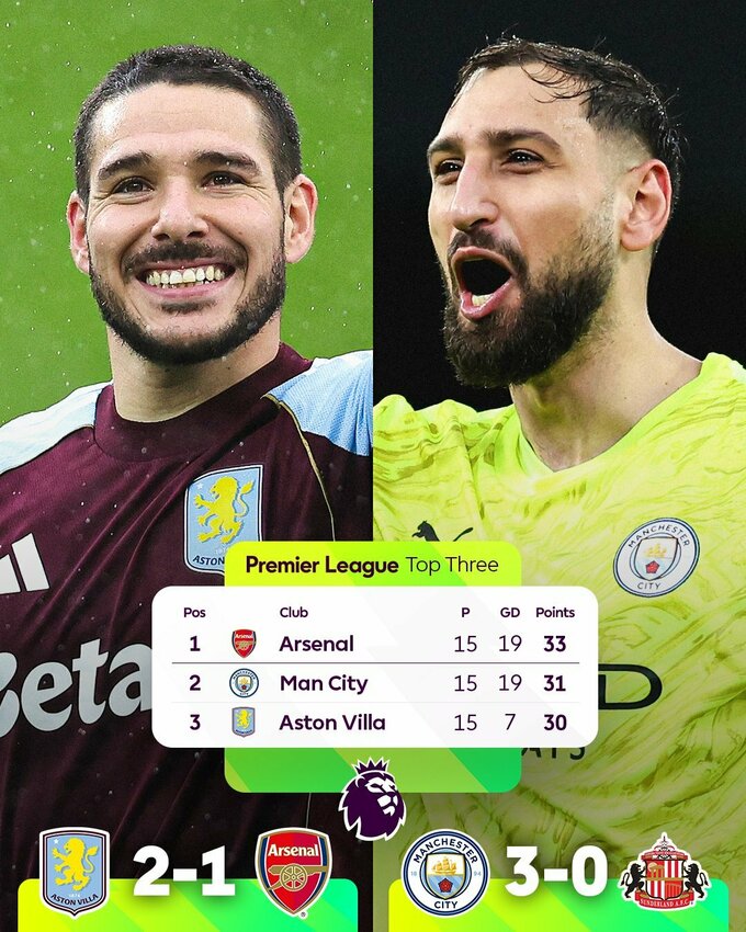Топ-10 АПЛ: Арсенал (33 пункти), Манчестер Сіті (31), Астон Вілла (30), Крістал Пелес (26), Челсі, МЮ (по 25), Евертон (24), Брайтон, Сандерленд, Ліверпуль (по 23).