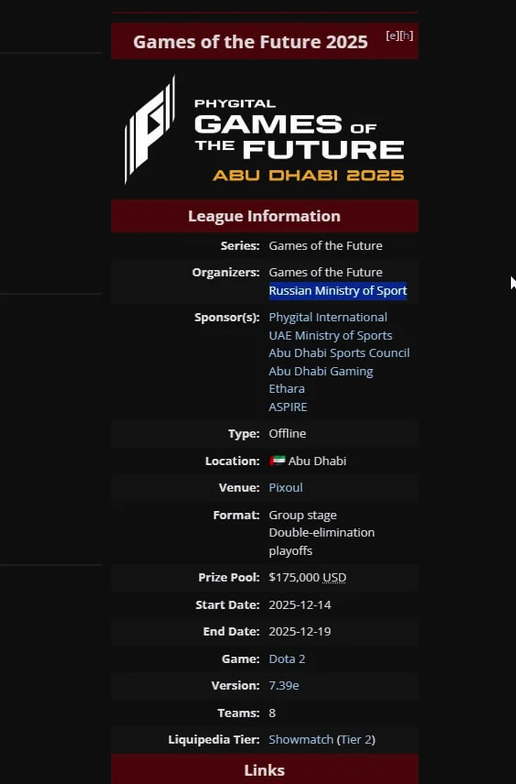 Раніше на сторінці турніру на Liquipedia була вказівка, що одним із організаторів події є міністерство спорту рф. Згодом цю інформацію видалив російський адміністратор Dgondi.