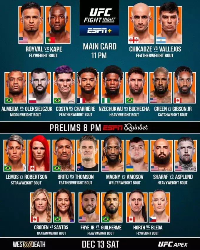 Головною подією шоу стане нетитульний 5-раундовий поєдинок у ваговій категорії до 56,7 кг – в октагоні зустрінуться американець Брендон Ройвал (17–8) і представник Анголи Манель Капе (21–7).