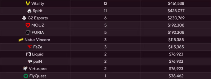 Це принесло клубу $461 538. Spirit, що набрали 11 токенів, отримали $423 077. Найближчими переслідувачами стали G2 – вони заробили шість токенів і $230 769.