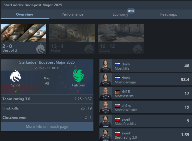 Це вже шістнадцятий мейджор для Ніколи «NiKo» Ковача, який він намагається здобути за свою кар'єру. Іван «zweih» Гогін провів один із найкращих матчів на LAN у своїй кар’єрі, повівши команду Spirit до впевненої перемоги над Falcons у чвертьфіналі Budapest Major. Російський гравець оформив еси на обох мапах, ставши ключовою рушійною силою тріумфу.