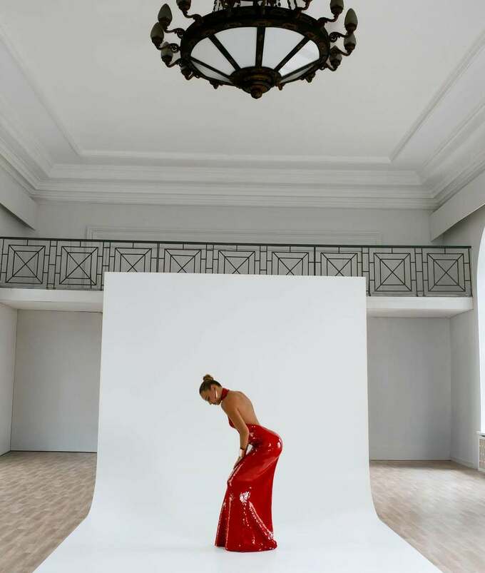 На фото спортсменка позує у довгій блискучій червоній сукні з відкритою спиною – образ підкреслює її грацію та відмінну спортивну форму.