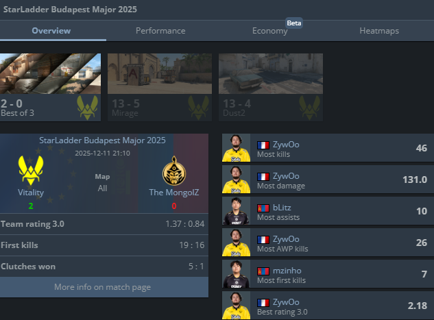 Vitality продемонстрували форму, близьку до ідеальної. Зірковий француз Матьє «ZywOo» Ербо домінував від першого раунду, а вся команда діяла злагоджено і впевнено.