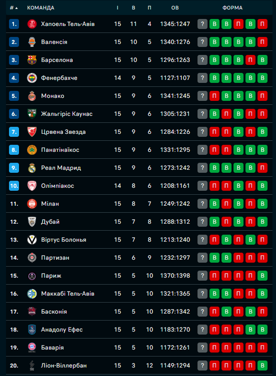 Завершився 15-й тур Євроліги