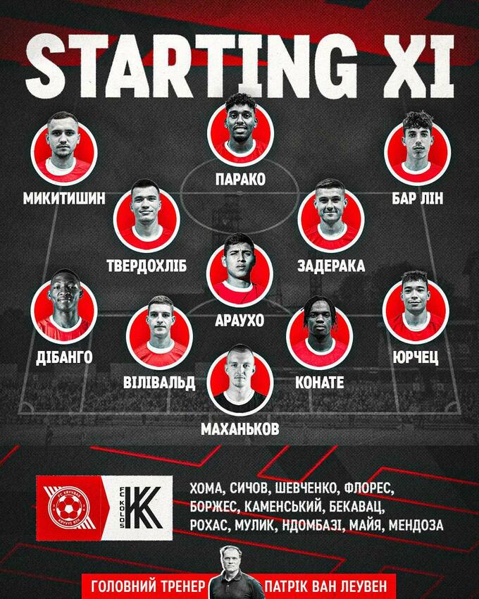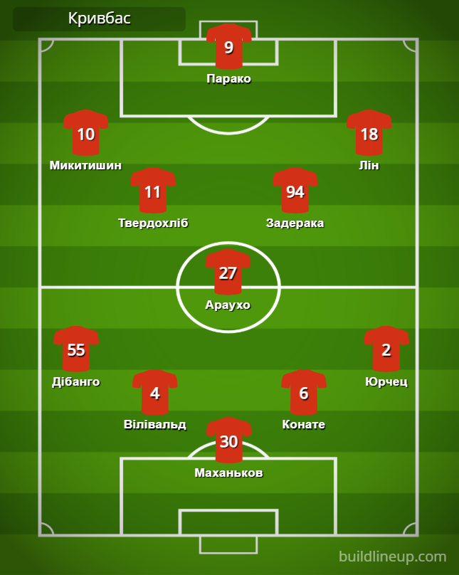 «Кривбас»: Маханьков – Дібанго, Вілівальд, Конате, Юрчец – Твердохліб, Араухо, Задерака – Микитишин, Парако (Мендоза, 82), Лін.