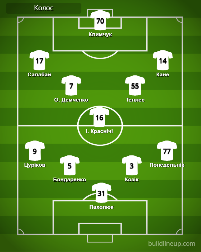 «Колос»: Пахолюк – Цуріков, Бондаренко, Козік, Понєдєльнік – О. Демченко (Челядін, 82), І. Краснічі, Теллес – Салабай, Климчук (Оєвусі, 82), Кане (Алефіренко, 63).