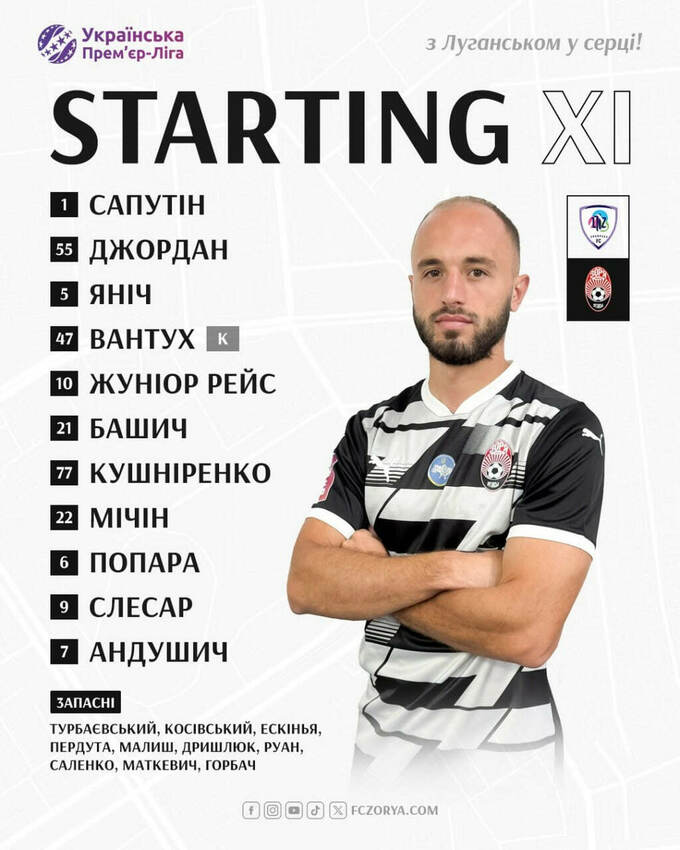 Старт Зорі: Сапутін – Вантух, Янич, Джордан, Жуніньйо – Попара, Башич, Кушніренко, Слесар – Андушич, Мічин