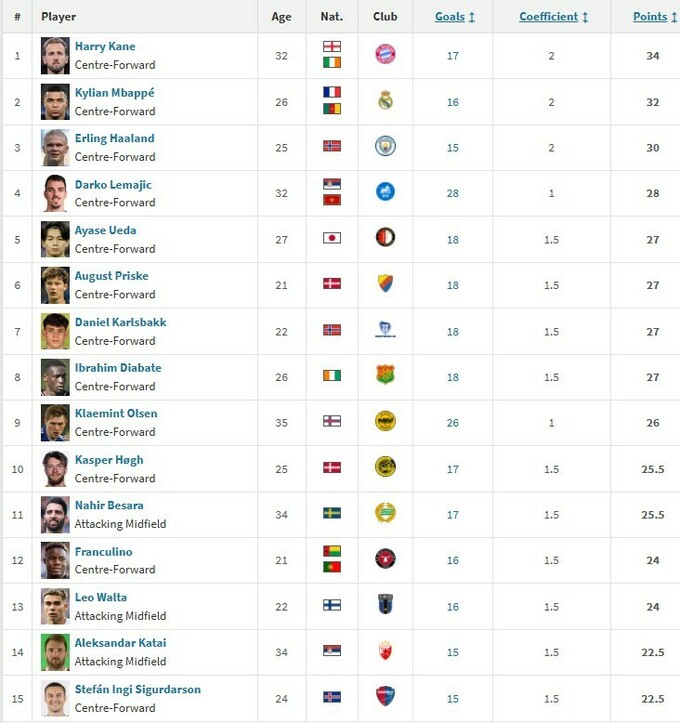 Третє місце посідає Ерлінг Холанд із Манчестер Сіті (15 голів у АПЛ, 30 балів).