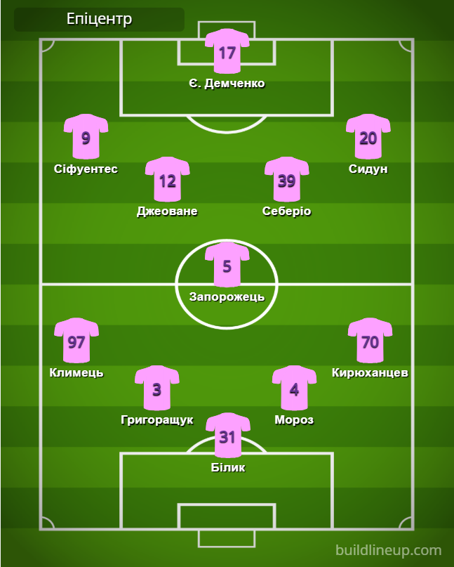 «Епіцентр»: Білик – Климець, Григоращук, Мороз, Кирюханцев (В. Кристін, 78) – Джеоване (Беженар, 58), Запорожець (Ліповуз, 46), Себеріо (Миронюк, 46) – Сіфуентес, Є. Демченко (С. Кристін, 46), Сидун.