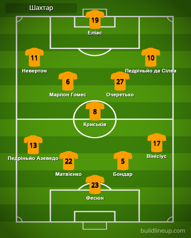 «Шахтар»: Фесюн – Педріньйо Азеведо, Матвієнко, Бондар, Вінісіус – Марлон Гомес (Ізакі, 73), Криськів (Назарина, 86), Очеретько – Невертон (Лукас, 86), Еліас (Мейрелліш, 74), Педріньйо да Сілва (Егіналду, 64).