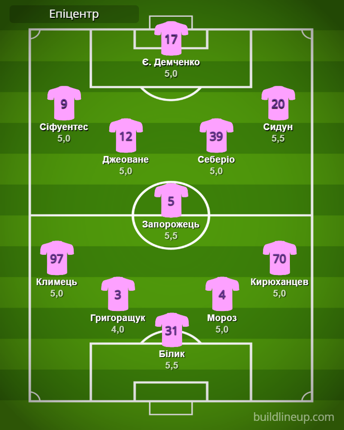 «Епіцентр»: Білик – Климець, Григоращук, Мороз, Кирюханцев (В. Кристін, 78) – Джеоване (Беженар, 58), Запорожець (Ліповуз, 46), Себеріо (Миронюк, 46) – Сіфуентес, Є. Демченко (С. Кристін, 46), Сидун.