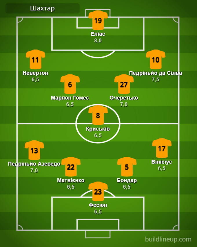 «Шахтар»: Фесюн – Педріньйо Азеведо, Матвієнко, Бондар, Вінісіус – Марлон Гомес (Ізакі, 73), Криськів (Назарина, 86), Очеретько – Невертон (Лукас, 86), Еліас (Мейрелліш, 74), Педріньйо да Сілва (Егіналду, 64).