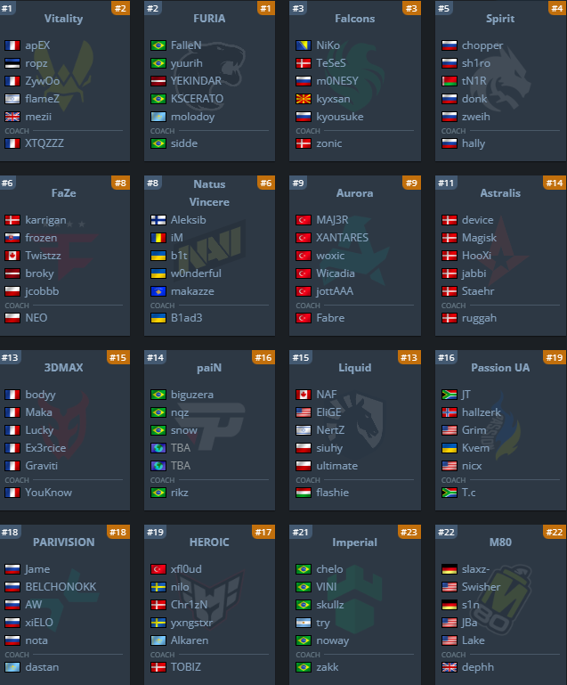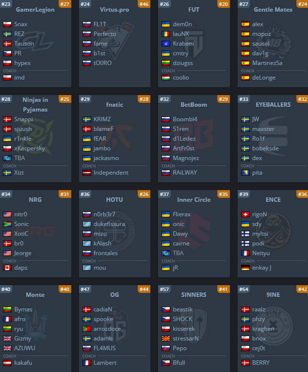Серед українських клубів та команд з українцями, які присутні, фігурують NAVI, FUT Esports, Monte, Inner Circle, fnatic, Passion UA та NiP.