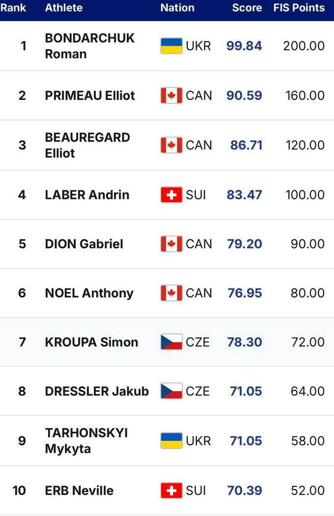 Результати інших українців: Микита Тархонський – дев'ятий (71.05 очок), Роман Сінюк – 11-й (70.39), Венсан Хорлука-Коваленко – 13-й (59.80).