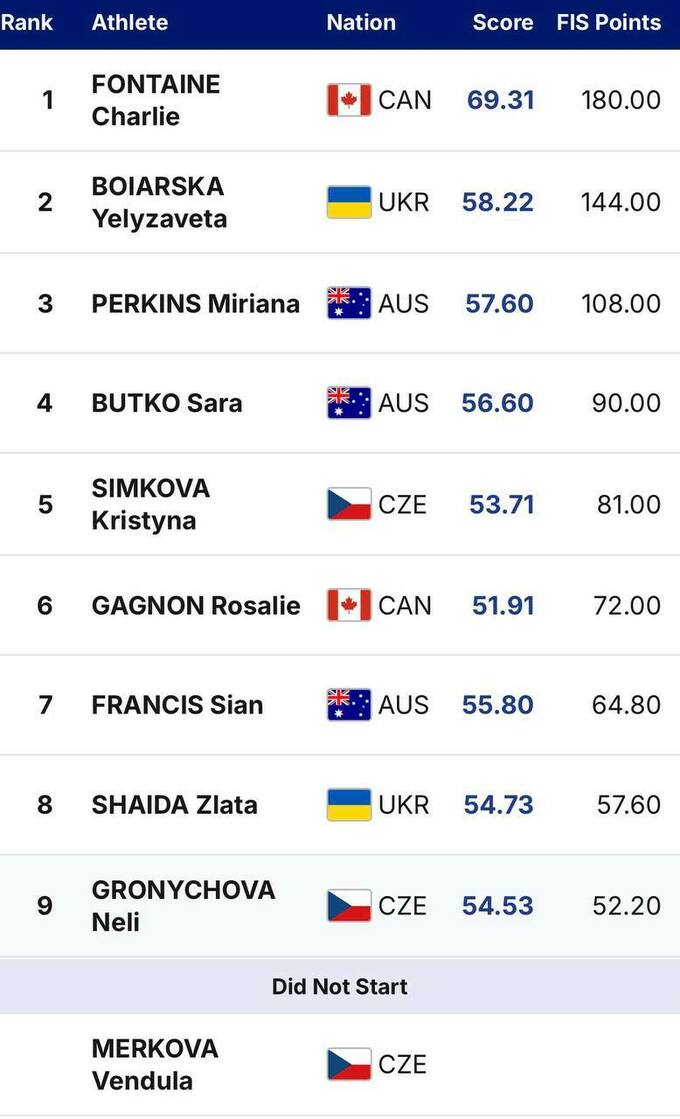 Тріумф відсвяткувала канадська спортсменка Чарлі Фонтен: судді оцінили її виступ у 69.31 бала, що принесло їй золоту медаль.