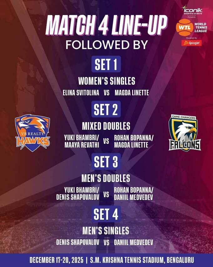 18 грудня проходить матчеве протистояння команд VB Realty Hawks («Яструби») і Game Changers Falcons («Соколи») на виставковому турнірі World Tennis League в Бенгалуру, Індія.