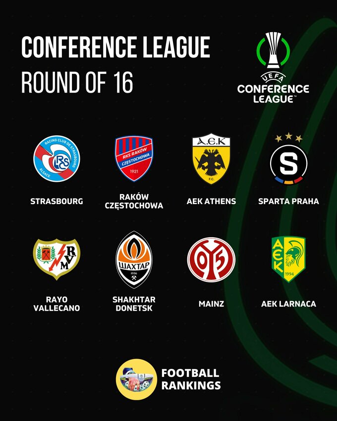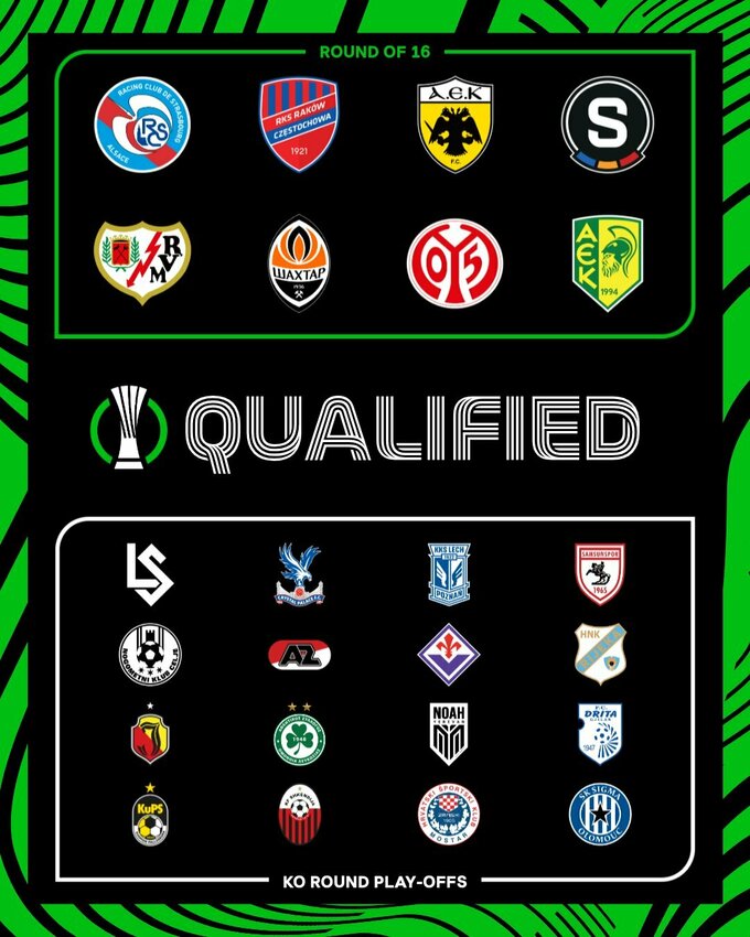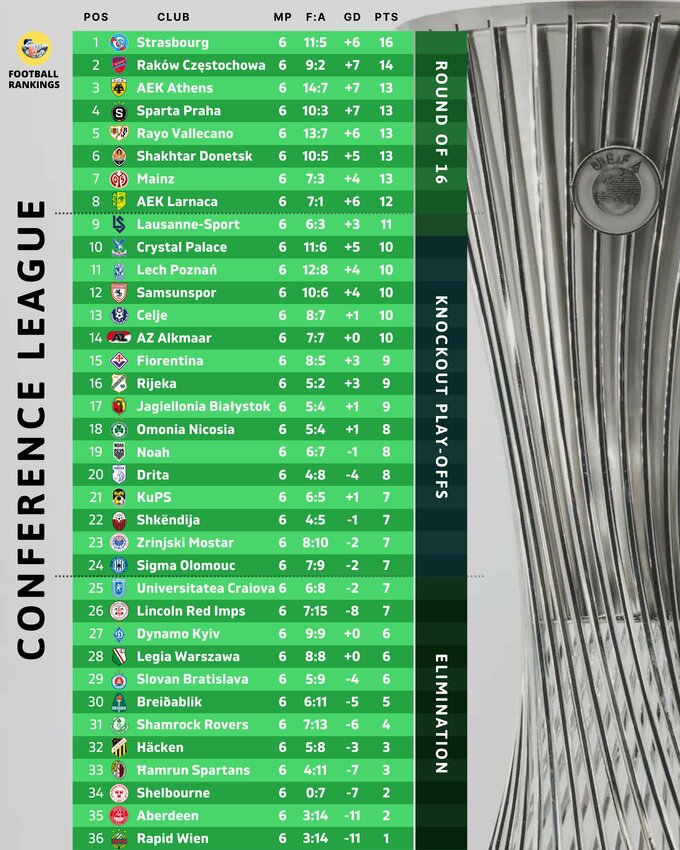 | 8 | АЕК Ларнака | 6 | 3 | 3 | 0 | 7 - 1 | 18.12.25 АЕК Ларнака 1:0 Шкендія11.12.25 Хеккен 1:1 АЕК Ларнака27.11.25 Рієка 0:0 АЕК Ларнака06.11.25 АЕК Ларнака 0:0 Абердін23.10.25 Крістал Пелес 0:1 АЕК Ларнака | 12 | |