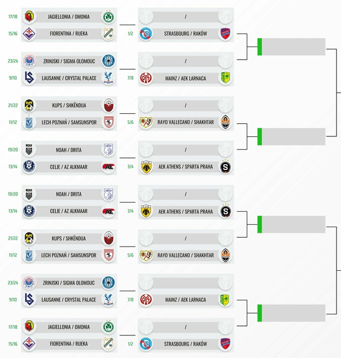 | 17 | Ягеллонія | 6 | 2 | 3 | 1 | 5 - 4 | 18.12.25 АЗ Алкмар 0:0 Ягеллонія11.12.25 Ягеллонія 1:2 Райо Вальєкано27.11.25 Ягеллонія 1:0 КуПС06.11.25 Шкендія 1:1 Ягеллонія23.10.25 Страсбург 1:1 Ягеллонія | 9 | |