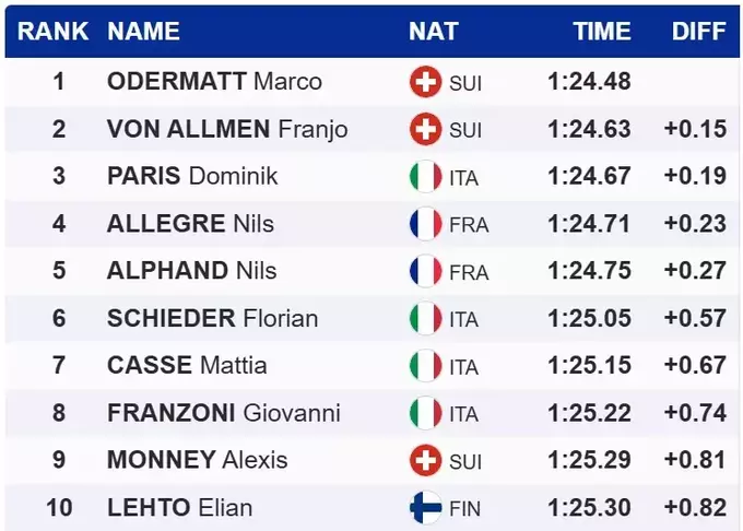 Лідер загального заліку Марко Одерматт завоював 50-ту перемогу на рівні Кубка світу, показавший загальний час – 1:24.48.