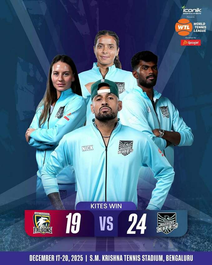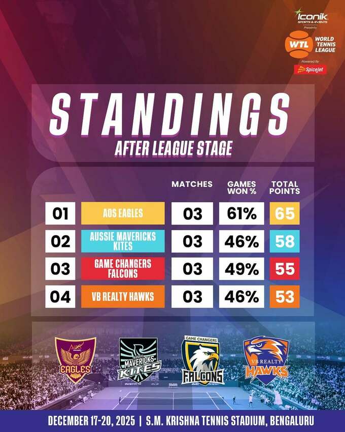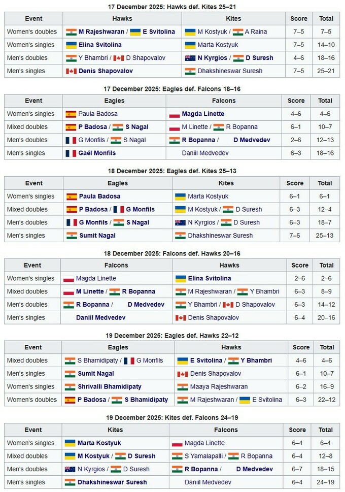 В останньому матчевому протистоянні групового етапу World Tennis League в Бенгалуру (Індія) команда Aussie Mavericks Kites («Шуліки») переграла Game Changers Falcons («Соколи») із загальним рахунком 24:19.