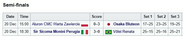 У суботу, 20 грудня, відбулися матчі 1/2 фіналу Клубного чемпіонату світу з волейболу серед чоловічих команд. Упродовж одного ігрового дня було зіграно два поєдинки, які визначили повний склад фіналістів турніру.