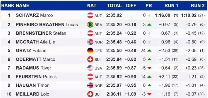 Хоч Марко не зовсім вдало проявив себе в другому спуску (21-ша позиція), йому вдалося випередити друге місце на 0.18 секунди.